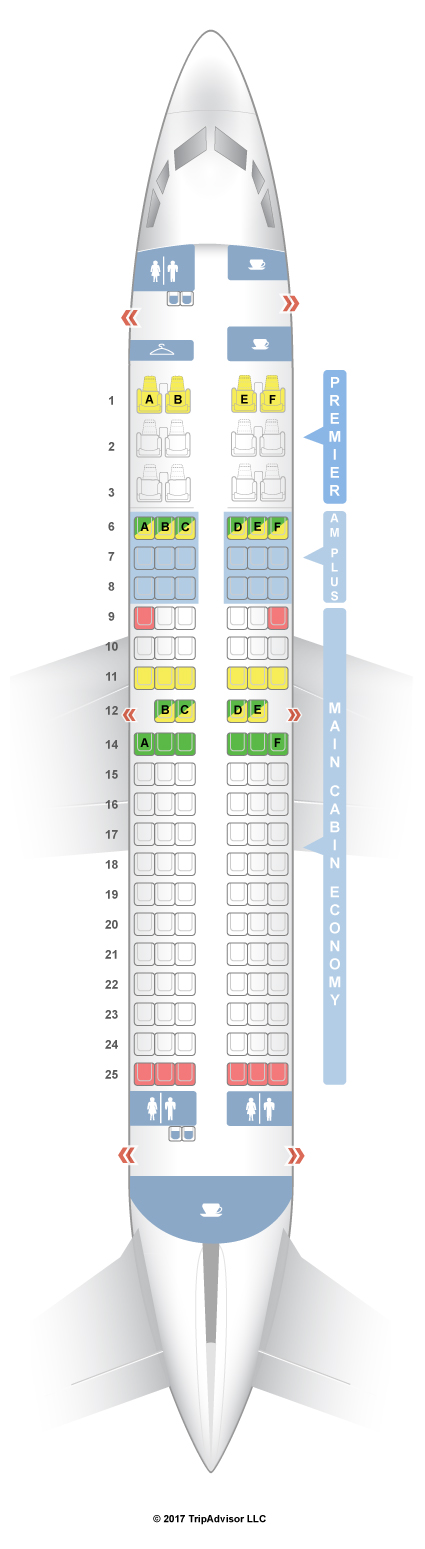 This aircraft flies with 12 Clase Premier seats, 18 AM Plus seats and 94 Economy Class seats. The AM Plus seats offer passengers an additional 3" of legroom and an extra 1.5" recline compared to the standard Main Cabin Economy Class seats.